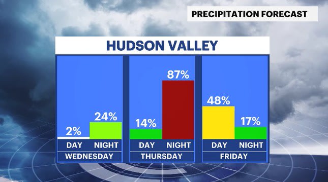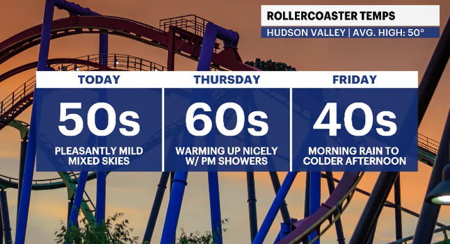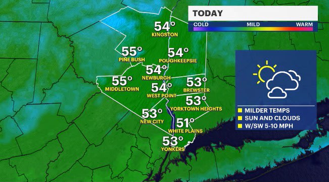The normal high is 50 degrees for this time of year, and we'll hit that number in many spots in the Hudson Valley today. Temperatures will trend above average overnight as clouds hang around along with a light breeze. This will help to get Thursday's temps off to a good head start, as they will go way above average.
