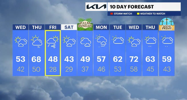 FRIDAY: WEATHER TO WATCH - Rain fades in the morning hours with drier and breezy winds moving in. Temps will trend colder as the day progresses. Highs: upper 40s. Lows: upper 20s.